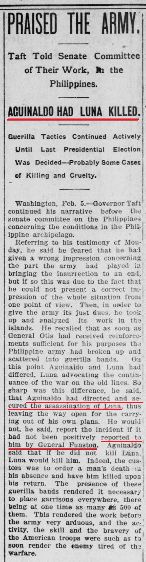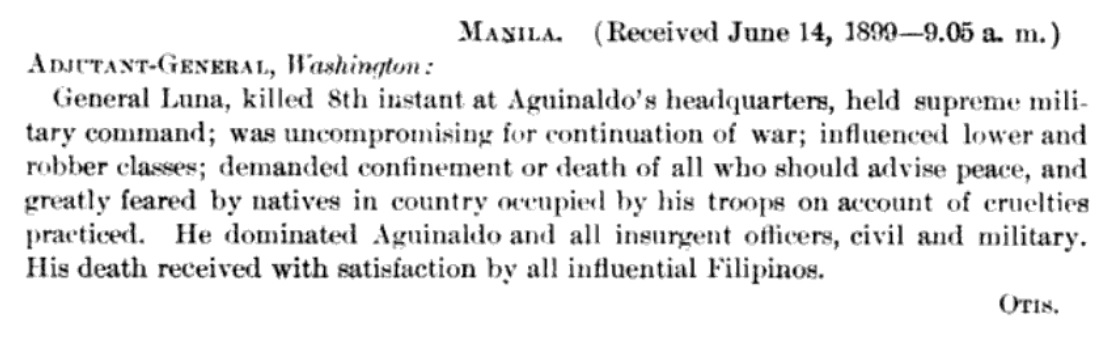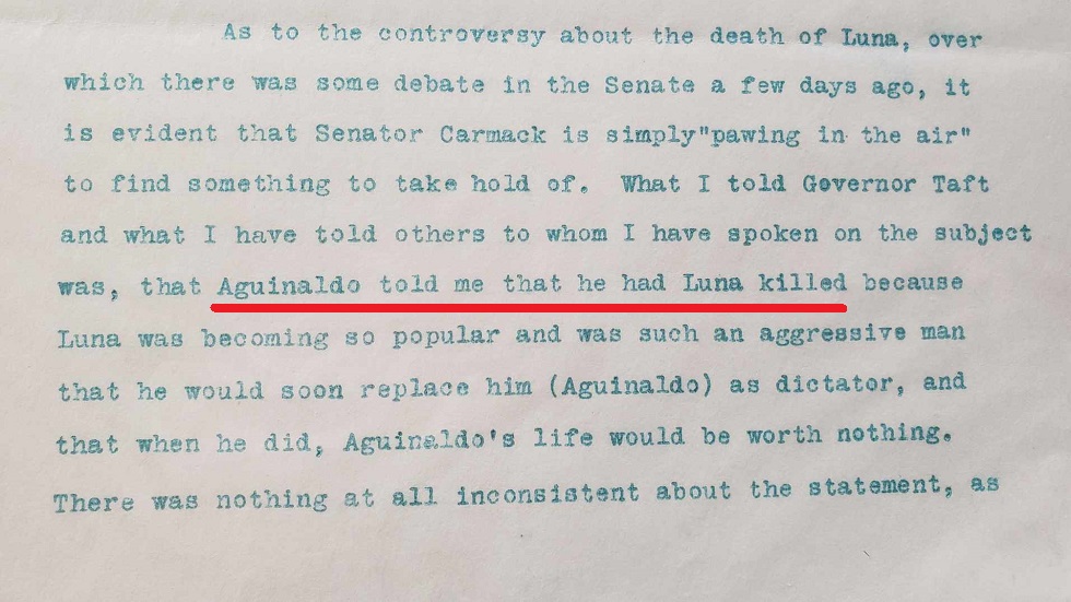 Instead, Aguinaldo may have volunteered the information freely, without coercion, that he had ordered Luna killed. This could potentially make himself palatable to the Americans and make them open to negotiations. After all, his objective was to negotiate, not to fight, and this was the source of conflict between him and Luna. Also, Luna happened to be the best opponent the Americans had met, and they were very much happy with him gone. So it's like saying to the Americans, hey look, I killed your worst enemy, I did you a favor, I'm somebody you can talk with. Let's talk.
