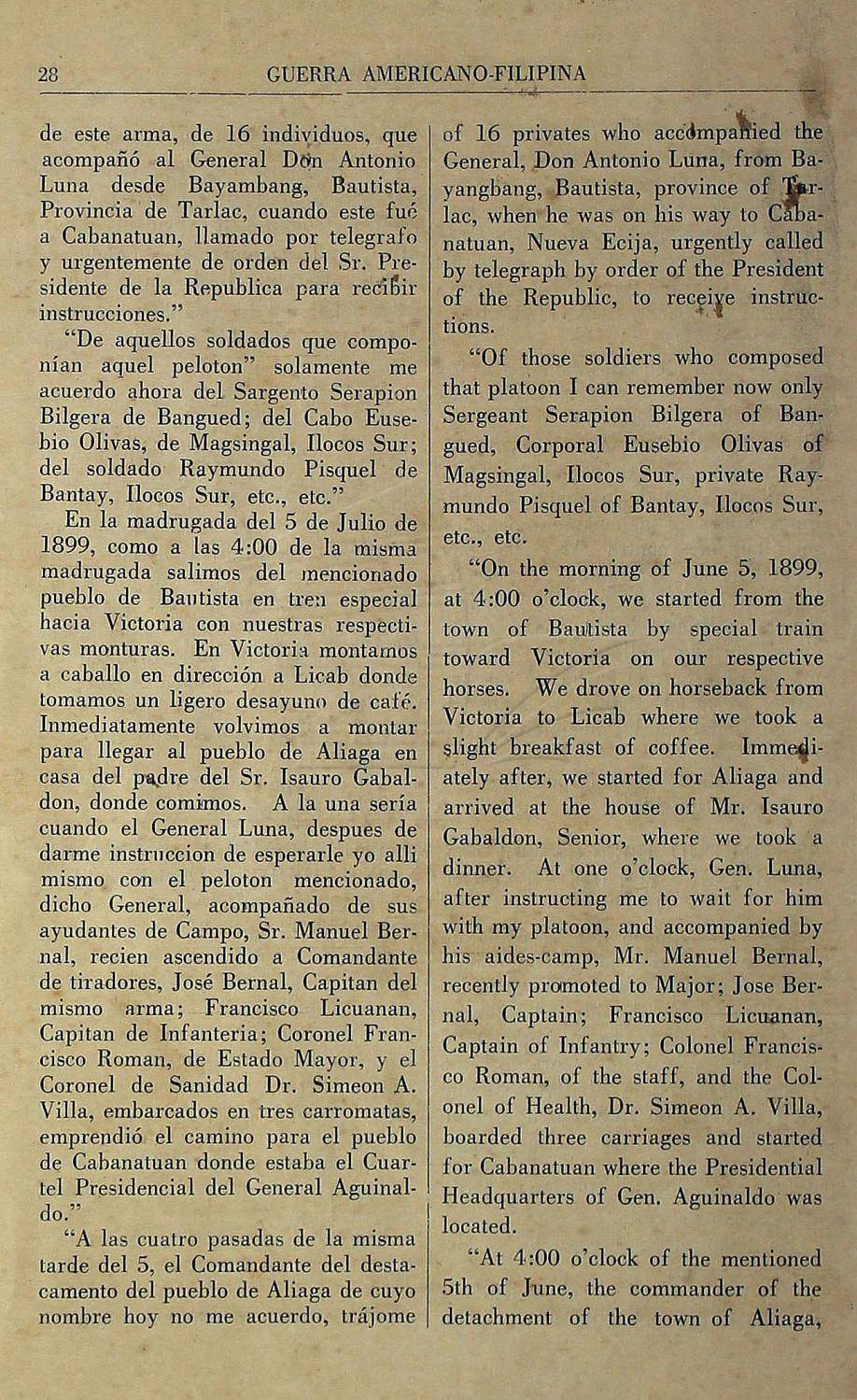 "On the morning of June 5, 1899, at 4:00 o'clock, we started from the town of Bautista by special train toward Victoria on our respective horses. We drove on horseback from Victoria to Licab where we took a slight breakfast of coffee. Immediately after, we started for Aliaga and arrived at the house of Mr. Isauro Gabaldon, Senior, where we took a dinner. At one o'clock, Gen. Luna, after instructing me to wait for him with my platoon, and accompanied by his aides-camp, Mr. Manuel Bernal, recently promoted to Major; Jose Bernal, Captain; Francisco Licuanan, Captain of Infantry; Colonel Francisco Roman, of the staff, and the Colonel of Health, Dr. Simeon A. Villa, boarded three carriages and started for Cabanatuan where the Presidential Headquarters of Gen. Aguinaldo was located.