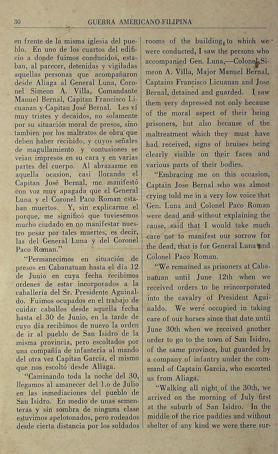 "Embracing me on this occasion, Captain Jose Bernal who was almost crying told me in a very low voice that Gen. Luna and Colonel Paco Roman were dead and without explaining the cause, said that I would take much care not to manifest our sorrow for the dead, that is for General Luna and Colonel Paco Roman.