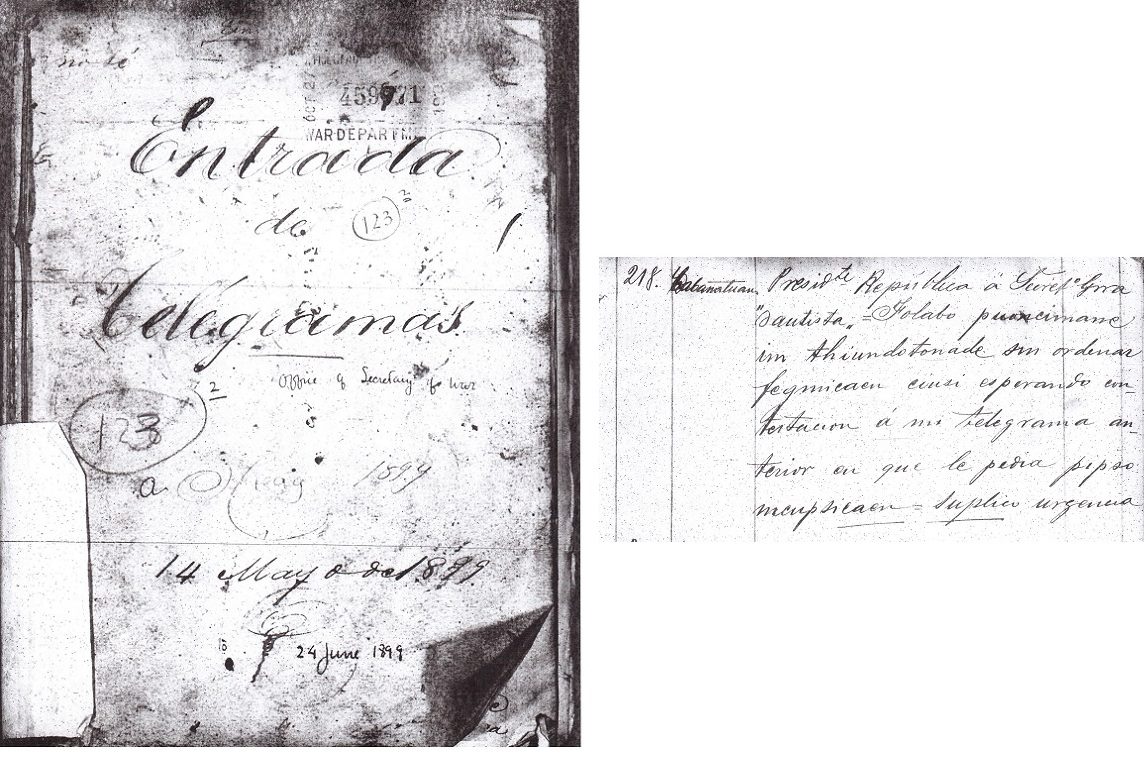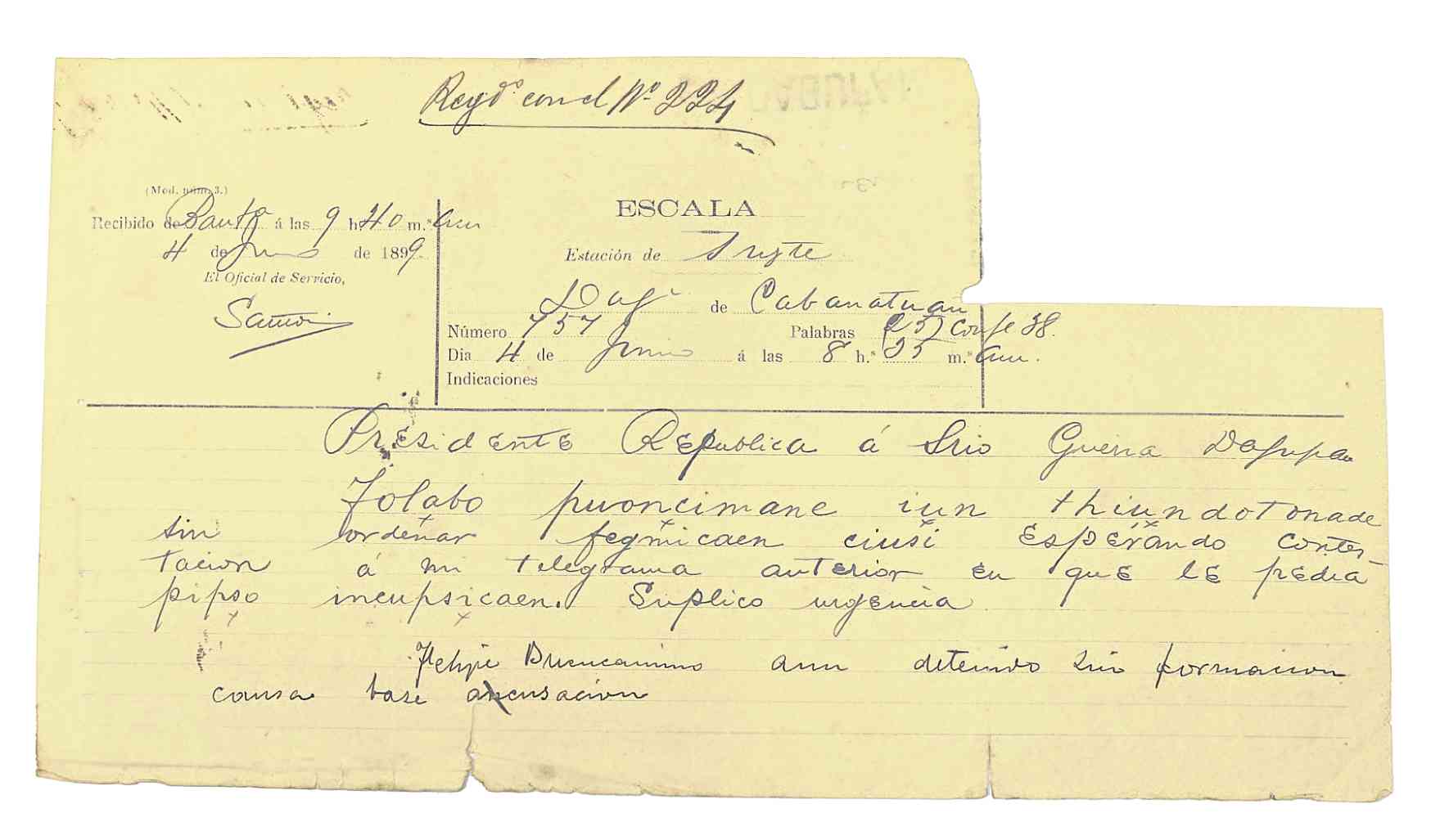 Pangasinan, June 4, 1899: General Antonio Luna’s clerk copies a telegram received from the “Presidente [de la] Republica” into the “Entrada de Telegramas” book.