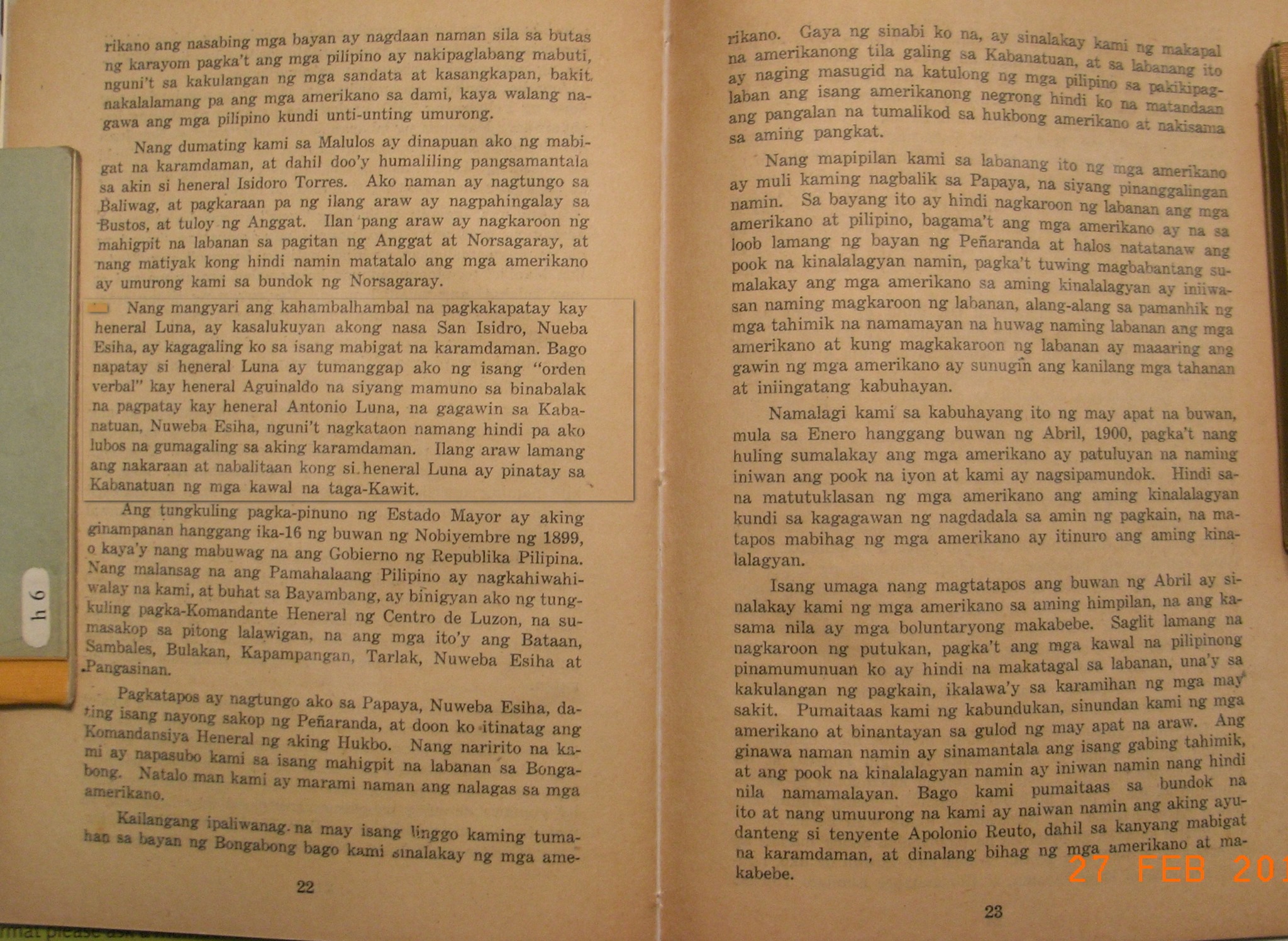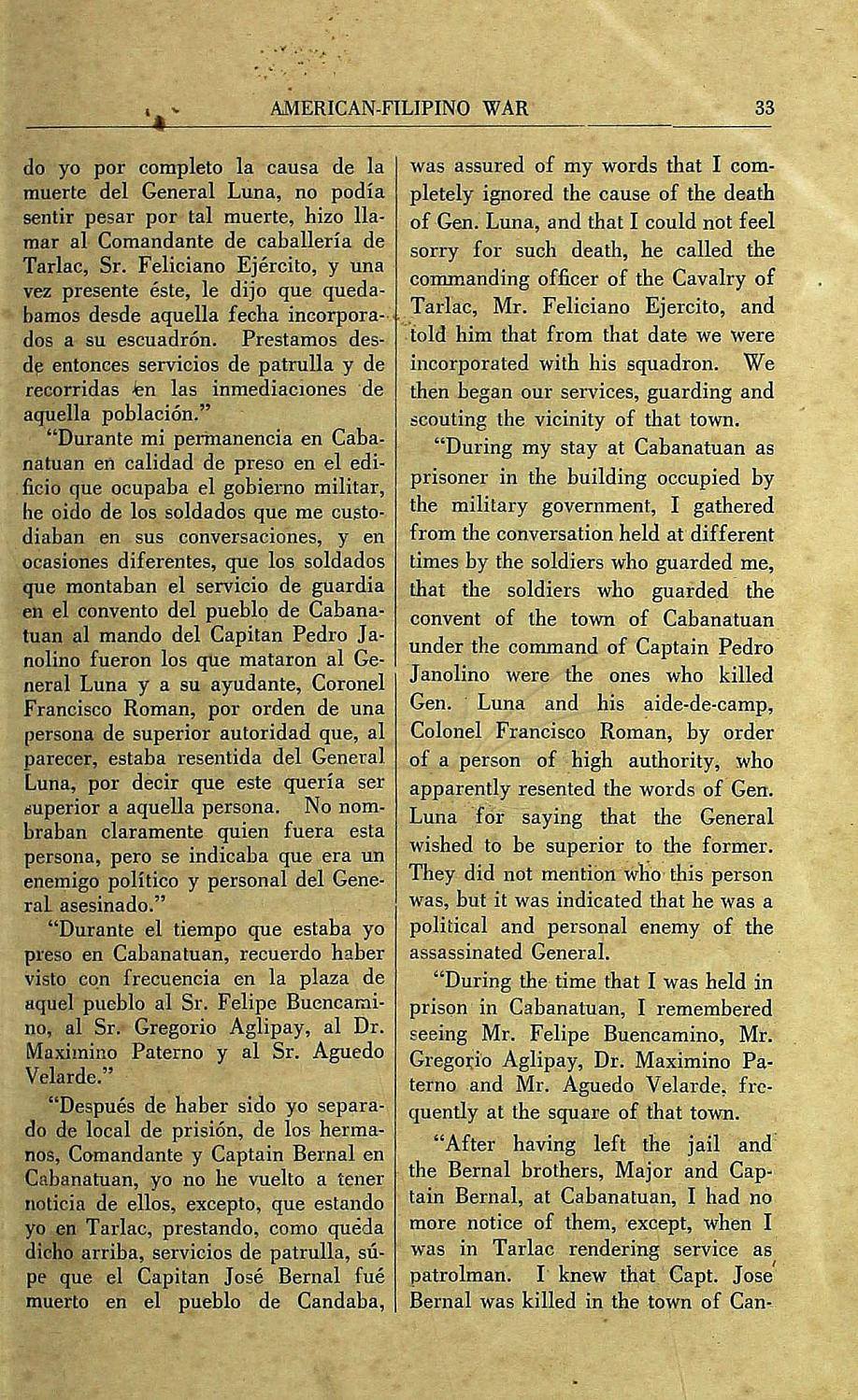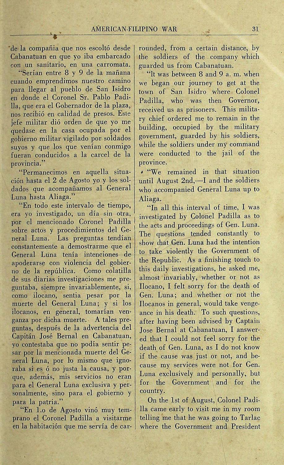 "In all this interval of time, I was investigated by Colonel Padilla as to the acts and proceedings of Gen. Luna. The questions tended constantly to show that Gen. Luna had the intention to take violently the Government of the Republic. As a finishing touch to this daily investigations, he asked me, almost invariably, whether or not as Ilocano, I felt sorry for the death of Gen. Luna; and whether or not the Ilocanos in general, would take vengeance in his death. To such questions, after having been advised by Captain Jose Bernal at Cabanatuan, I answered that I could not feel sorry for the death of Gen. Luna, as I do not know if the cause was just or not, and because my services were not for Gen. Luna exclusively and personally, but for the Government and for the country.