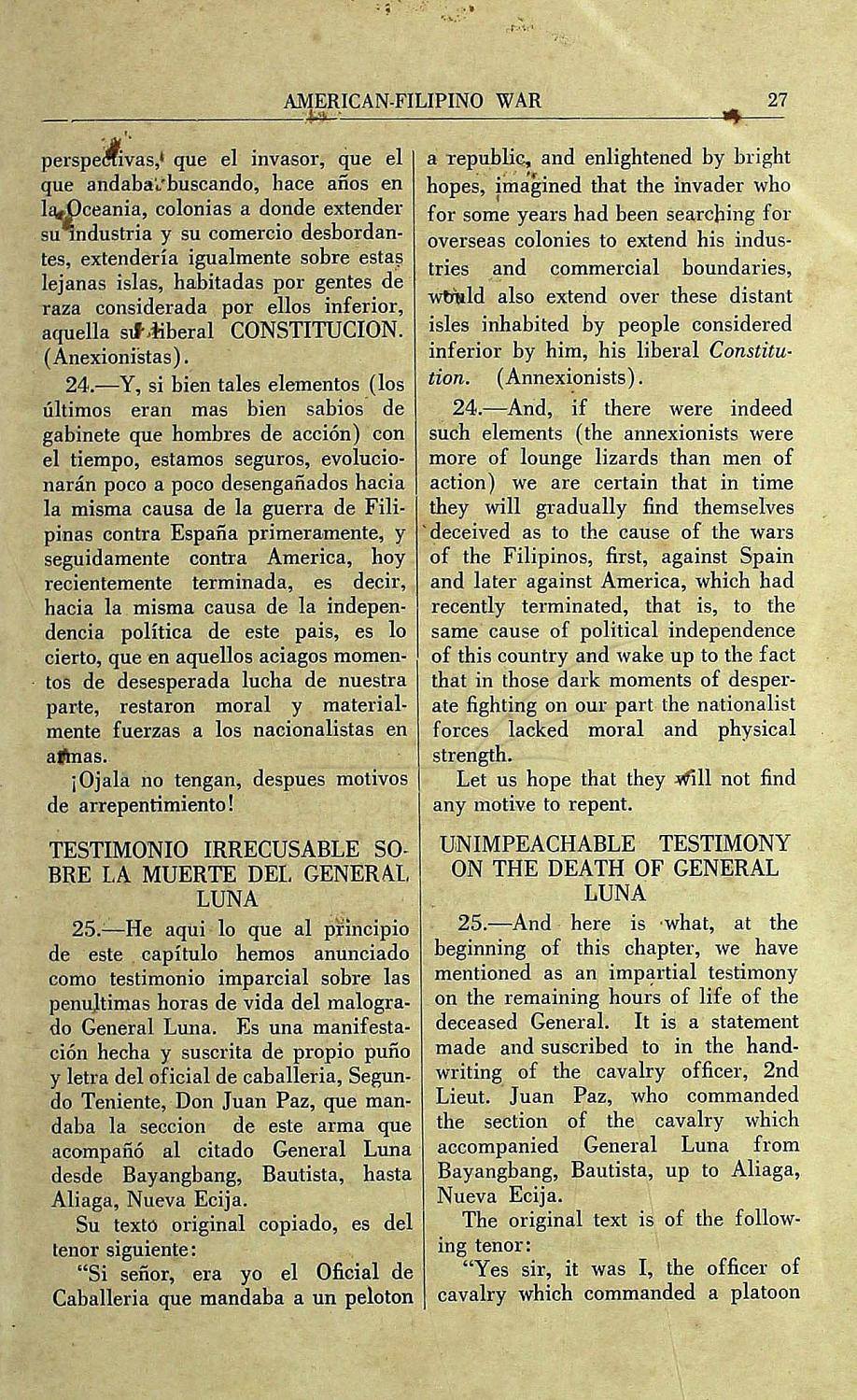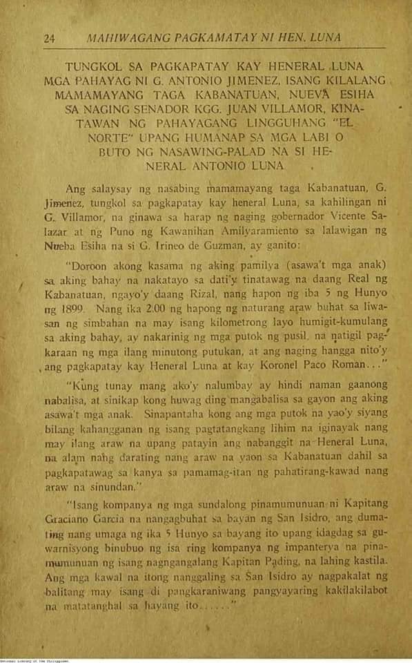 25. And here is what, at the beginning of this chapter, we have mentioned as an impartial testimony on the remaining hours of life of the deceased General. It is a statement made and subscribed to in the handwriting of the cavalry officer, 2nd Lieut. Juan Paz, who commanded the section of the cavalry which accompanied General Luna from Bayangbang, Bautista, up to Aliaga, Nueva Ecija.