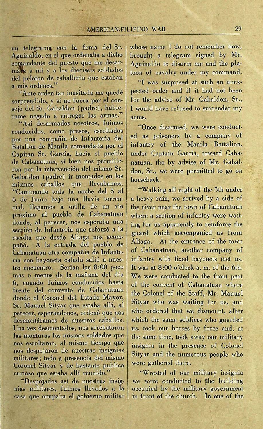 "Walking all night of the 5th under a heavy rain, we arrived by a side of the river near the town of Cabanatuan where a section of infantry were waiting for us apparently to reinforce the guard which accompanied us from Aliaga. At the entrance of the town of Cabanatuan, another company of infantry with fixed bayonets met us. It was at 8:00 o'clock a. m. of the 6th. We were conducted to the front part of the convent of Cabanatuan where the Colonel of the Staff, Mr. Manuel Sityar who was waiting for us, and who ordered that we dismount, after which the same soldiers who guarded us, took our horses by force and, at the same time, took away our military insignia in the presence of Colonel Sityar and the numerous people who were gathered there.