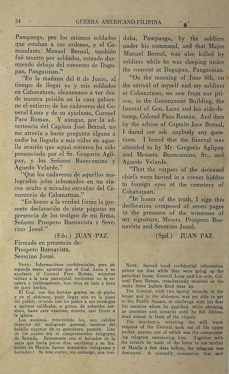 Statement of 2nd Lieut Juan Paz on the assassination of Gen. Antonio Luna
