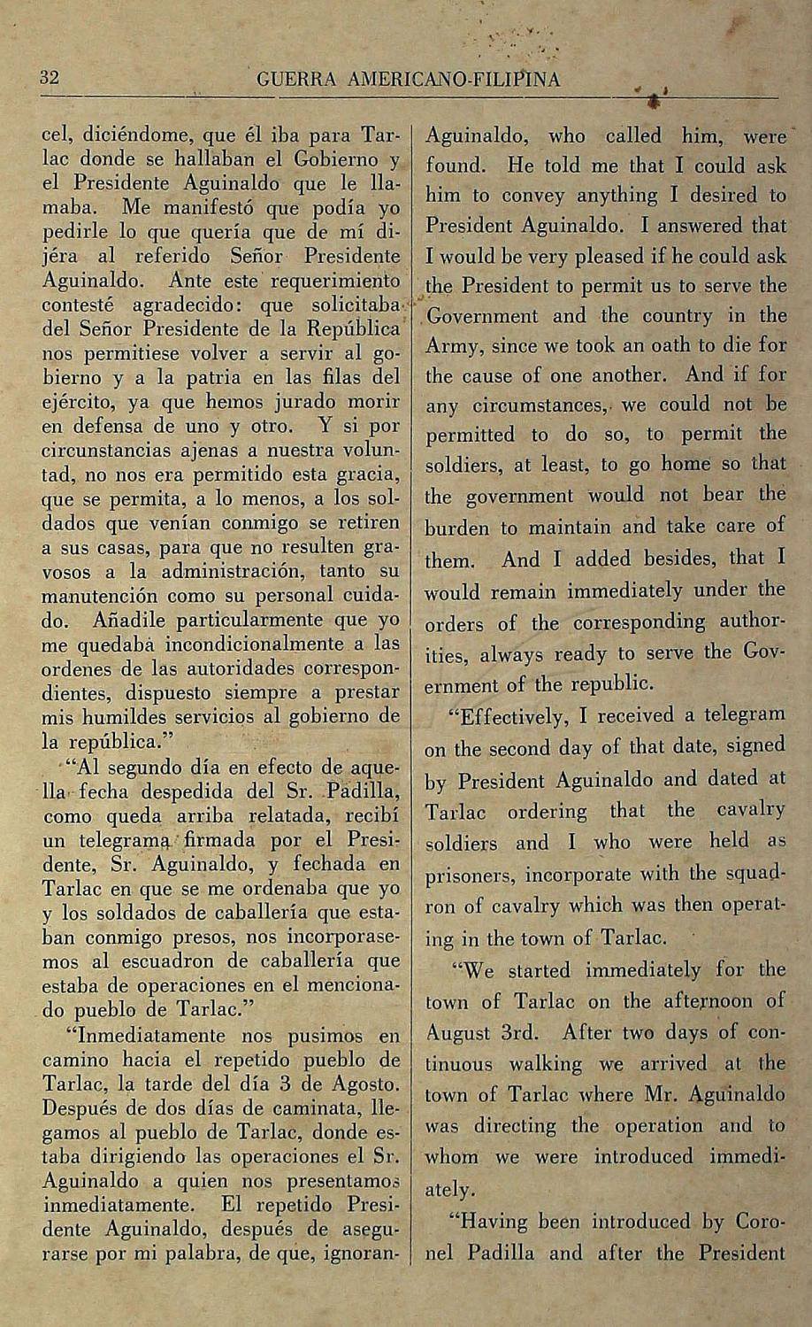 "Effectively, I received a telegram on the second day of that date, signed by President Aguinaldo and dated at Tarlac ordering that the cavalry soldiers and I who were held as prisoners, incorporate with the squadron of cavalry which was then operating in the town of Tarlac.