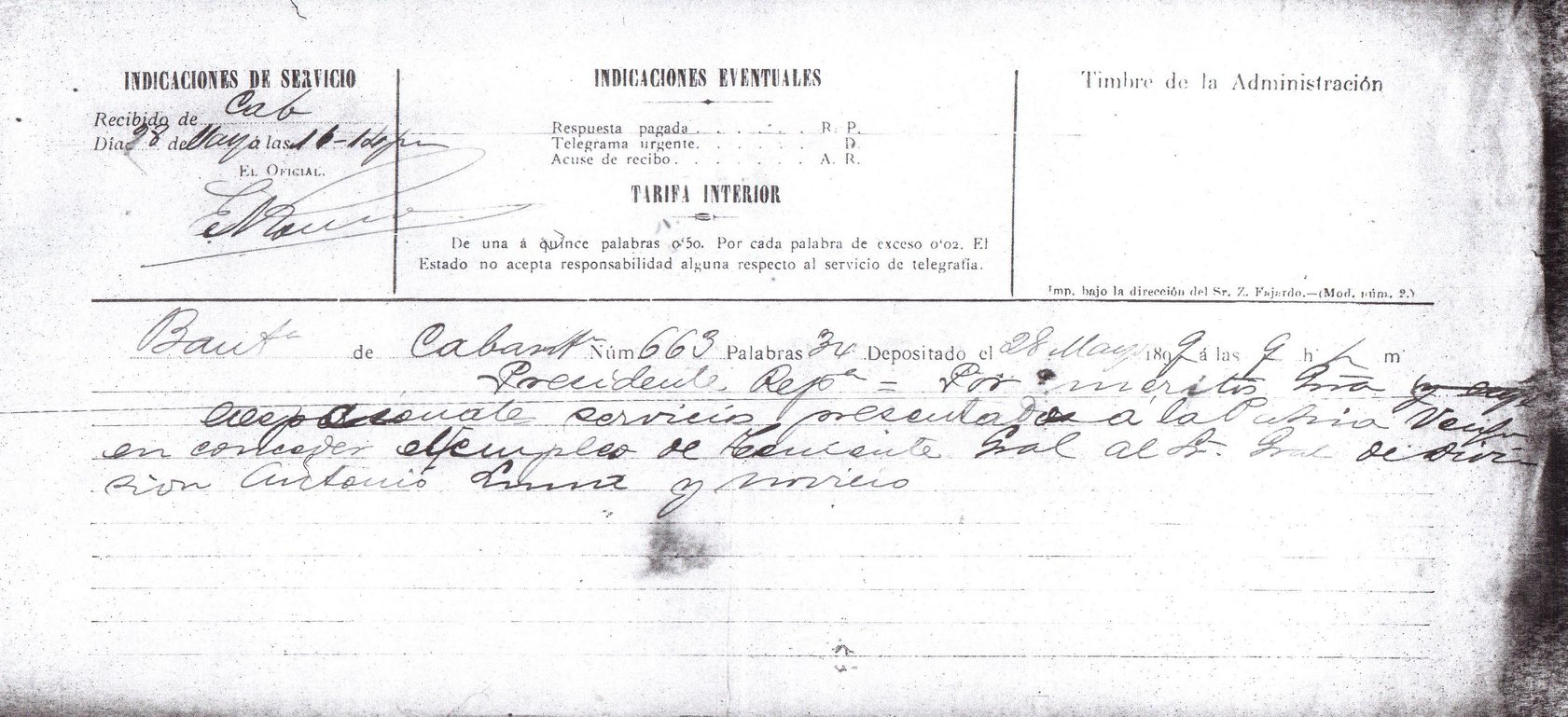 “ Presidente Republica a Secreto. Grra, Bautista: Felipe Buencamino aun detenido sin ordenar formación causa esperando contestación a mi telegrama anterior en que le pedía base acusación. Suplico urgencia.”