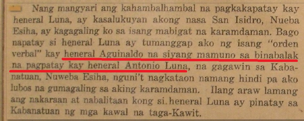 "During my stay at Cabanatuan as prisoner in the building occupied by the military government, I gathered from the conversation held at different times by the soldiers who guarded me, that the soldiers who guarded the convent of the town of Cabanatuan under the command of Captain Pedro Janolino were the ones who killed Gen. Luna and his aide-de-camp, Colonel Francisco Roman, by order of a person of high authority, who apparently resented the words of Gen. Luna for saying that the General wished to be superior to the former. They did not mention who this person was, but it was indicated that he was a political and personal enemy of the assassinated General.