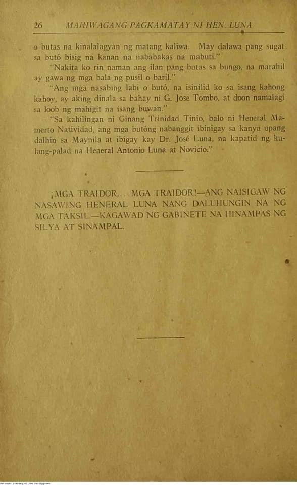 NOTE: Second hand confidential information points out that while they were going up the parochial house, General Luna and his aide, Colonel Paco Roman, treacherously received on the stairs three bullets fired near by.