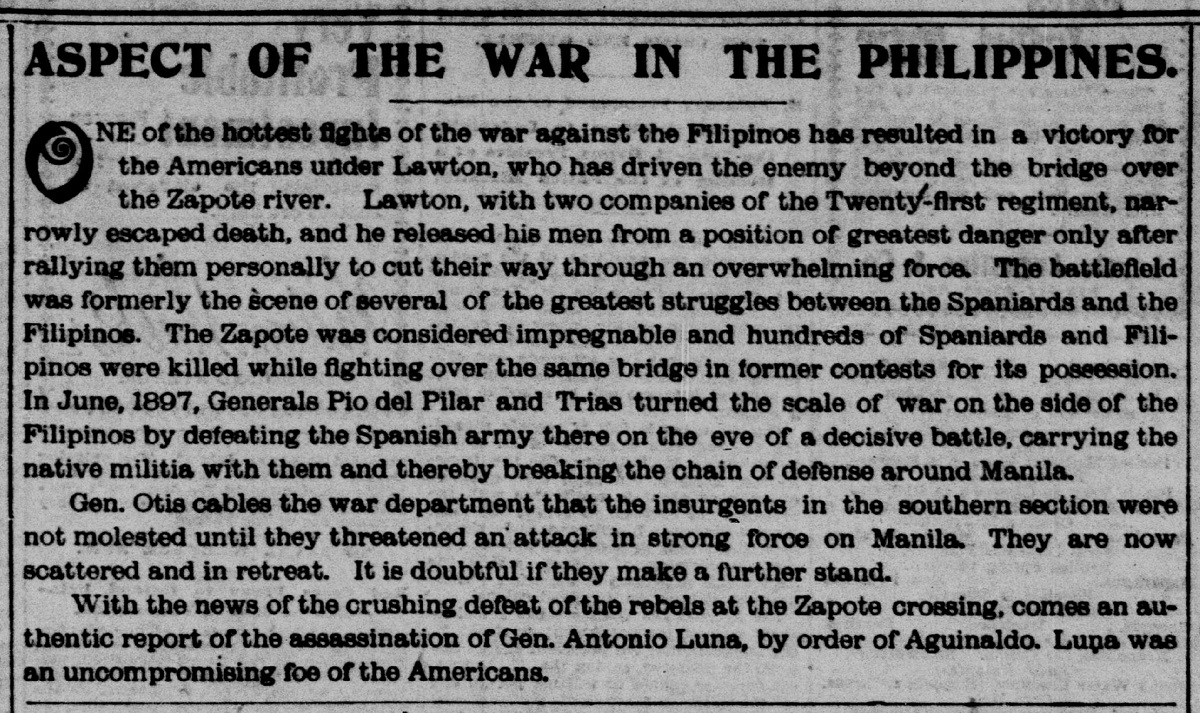 ONE of the hottest fights of the war against the Filipinos has resulted in a victory for the Americans under Lawton, who has driven the enemy beyond the bridge over the Zapote river. Lawton, with two companies of the Twenty-first regiment, narrowly escaped death, and he released his men from a position of greatest danger only after rallying them personally to cut their way through an overwhelming force. The battlefield was formerly the scene of several of the greatest struggles between the Spaniards and the Filipinos. The Zapote was considered impregnable and hundreds of Spaniards and Filipinos were killed while fighting over the same bridge in former contests for its possession. In June, 1897, Generals Pio del Pilar and Trias turned the scale of war on the side of the Filipinos by defeating the Spanish army there on the eve of a decisive battle, carrying the native militia with them and thereby breaking the chain of deftonse around Manila.