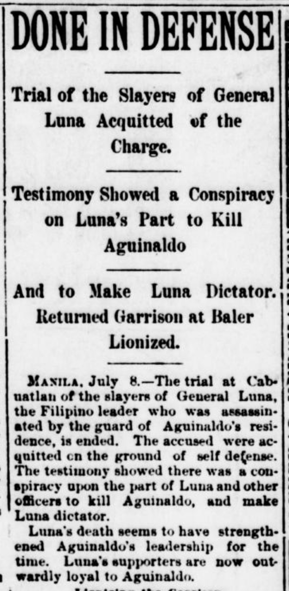 Antonio Luna was assassinated on June 5, 1899 at Cabanatuan, Nueva Ecija, on orders of Emilio Aguinaldo. Although the killing was premeditated, in the subsequent show trial of the assassins they fabricated this story that the assassination was instead an act of self defense. Testimonies however provided the motive for the killing. Aguinaldo was insecure of Luna. And here again, another story was fabricated that Luna was plotting against Aguinaldo.