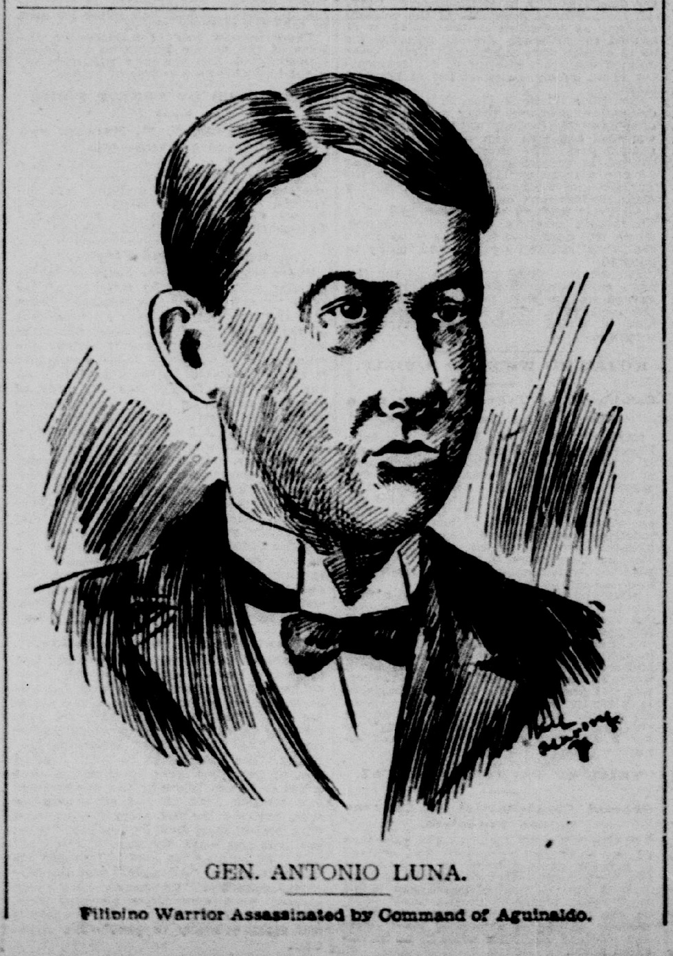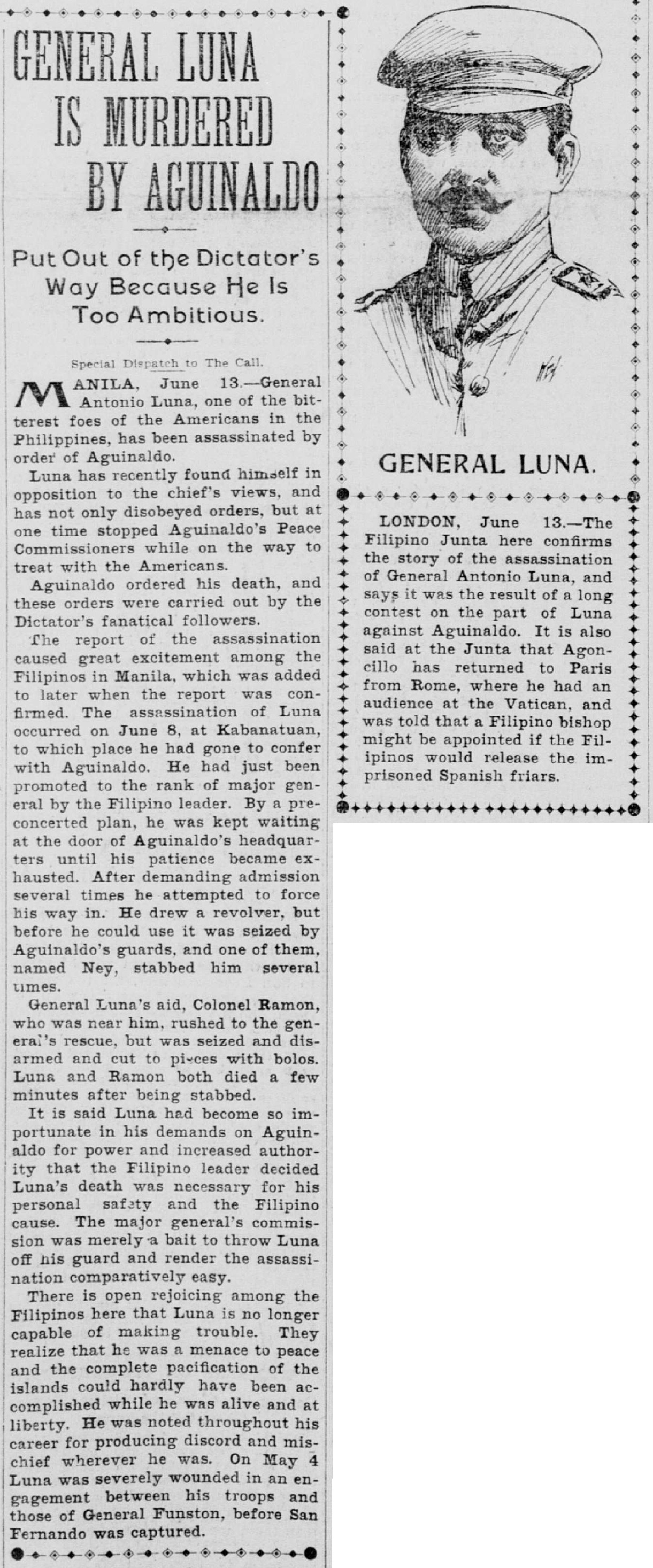 MANILA. June 13. - Gen. Antonio Luna, one of the bitterest foes of the Americans in the Philippines, has been assassinated by the order of Aguinaldo. Luna has recently found himself in opposition to the chief's views, and has not only disobeyed orders, but at one time stopped Aguinaldo's peace commissioners while on the way to treat with the Americans. Aguinaldo ordered his death and the orders were carried out by his fanatical followers.