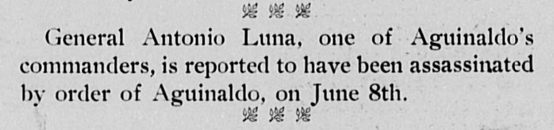 The assassination of Luna occurred on June 8th, at Kabanatuan, to which place he had gone to confer with Aguinaldo. He had just been promoted to the rank of major general by the Filipino leader.