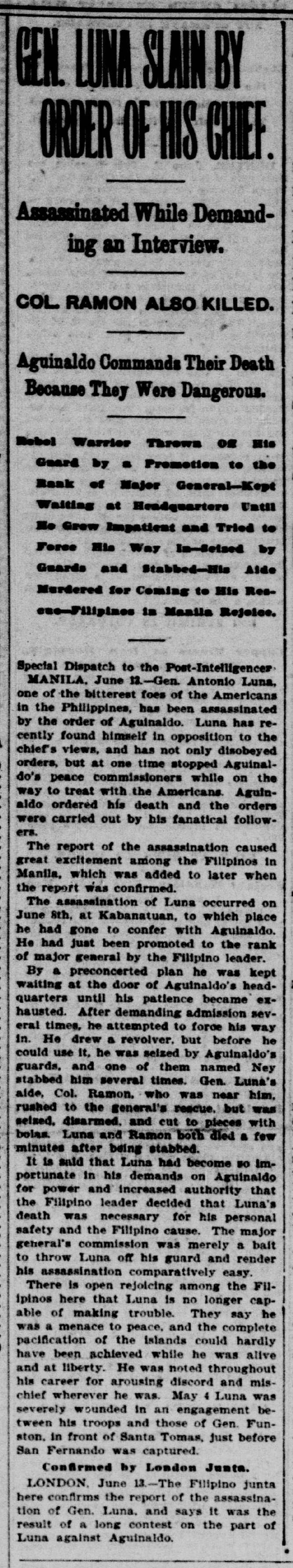 LONDON, June 13. - The Filipino junta here confirms the report of the Assassination of Gen. Luna, and says it was the result of a long contest on the part of Luna against Aguinaldo.