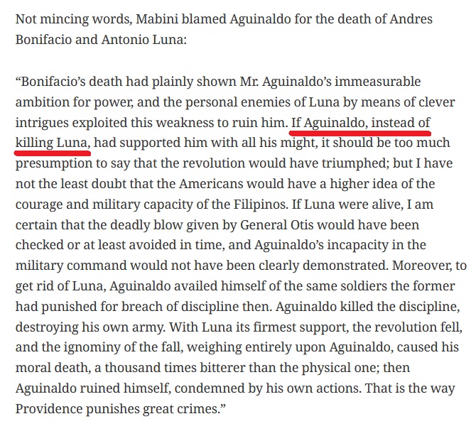 Not mincing words, Mabini blamed Aguinaldo for the death of Andres Bonifacio and Antonio Luna: