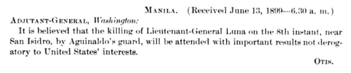 Luna’s promotion would have increased his pay from 50 to 55 pesos a month (!). But he never got it. On June 5, just eight days after this telegram was sent, he was killed in Cabanatuan by Aguinaldo’s presidential guards.
