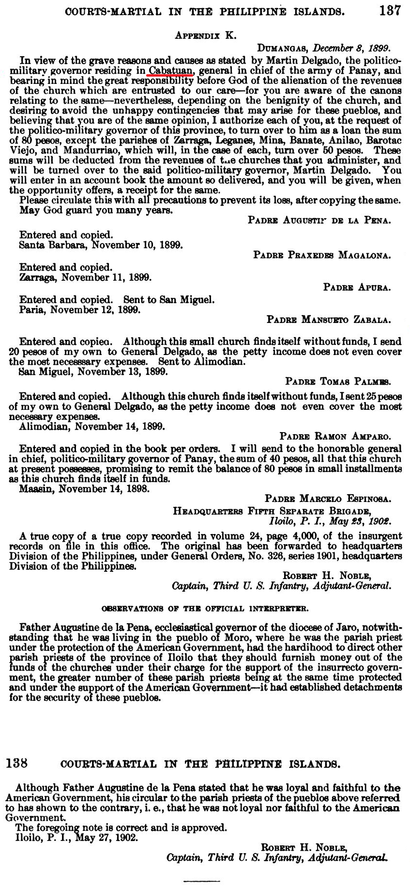 Father Augustine de la Pena, ecclesiastical governor of the diocese of Jaro, notwithstanding that he was living in the pueblo of Moro [Molo], where he was the parish priest under the protection of the American Government, had the hardihood to direct other parish priests of the province of Iloilo that they should furnish money out of the funds of the churches under their charge for the support of the insurrecto government, the greater number of these parish priests being at the same time protected and under the support of the American Government — it had established detachments for the security of these pueblos.