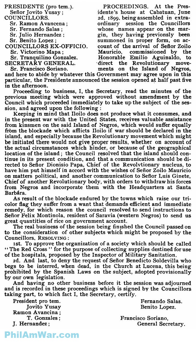 PROCEEDINGS. At the Presidente's house at Cabatuan, June 2d, 1899, being assembled in extraordinary session the Councillors whose names appear on the margin, they having previously been summoned in proper form, on account of the arrival of Seņor Zoilo Mauricio, commissioned by the Honorable Emilio Aguinaldo, to direct the Revolutionary movements on the Island of Negros, and here to abide by whatever this Government may agree upon in this particular, the Presidente announced the session opened at half past five in the afternoon.