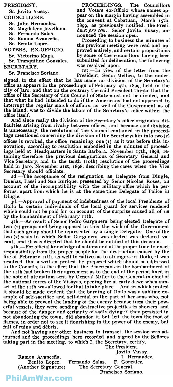 5th. - For official knowledge of nations and at the proper time to exact responsibility from the proper people for the destruction caused by the fire of February 11th, as well to natives as to strangers in Iloilo, it was resolved, that a written protest be prepared which should be addressed to the Consuls, to the effect that the Americans in the bombardment of the 11th had broken their agreement as to the end of the period fixed in the note of ultimatum sent by General Miller to the General-in-chief of the national forces of the Visayas, opening fire at early dawn when sunset of the 11th was allowed for that to take place. And in which protest it should be made evident that the burning of Iloilo was a sublime example of self-sacrifice and self-denial on the part of her sons who, not being able to prevent the landing of the enemy because from their powerful vessels, they were sending destructive projectiles in showers, and because of the danger and certainty of sadly dying if they persisted in not abandoning the town, did abandon it, but left the town the food of flames, in order not to see it flourishing in the power of the enemy, but full of ruins and debris.