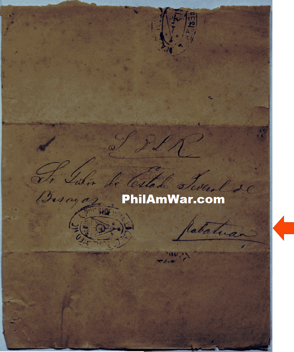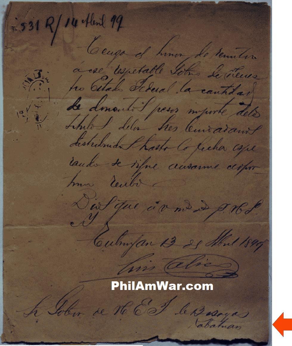 LETTER TO SEŅOR GOBERNADOR ESTADO FEDERAL DE BISAYAS IN KABATUAN (CABATUAN, ILOILO), APRIL 23 1899 Luis Calico in Tubungan writes to Seņor Gobernador de Estado Federal de Bisayas in Kabatuan (Cabatuan, Iloilo)