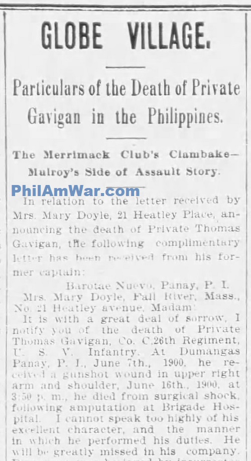 PARTICULARS OF THE DEATH OF PRIVATE GAVIGAN IN THE PHILIPPINES