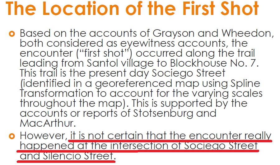 "In 2014, another attempt to verify the location was done by overlapping existing maps from the period and studying them considering contemporary accounts. It affirmed that the first encounter happened alongSilencio Street(should be Sociego Street), although the exact location where the first shot was fired could not be determined definitively."