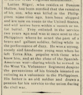 Lucian Sliger, who resides at Possum Hollow, has been notified that the remains of his son, who was killed in the Philippines some time ago, have been shipped and are now en route to the United States and will arrive here within a month or so for burial. Troy enlisted in the service two years ago and was at once sent to the Philippines where he acted the part of a brave and gallant soldier, falling while in the performance of duty. He was a strong, steady and handsome young man when he left Terra Alta, popular with those who knew him, and at the close of the Spanish-American war - during which he served in the West Va. Volunteer Regiment despite the persuasions of his friends insisted on enlisting as a volunteer to the Philippines. His father is an old soldier and draws a pension for his service to the union during the civil war.