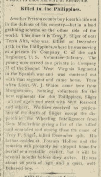 Another Preston county boy loses his life not in the defense of his country - but in a land grabbing scheme on the other side of the world. This time it is Troy P. Sliger of near Terra Alta, who was killed on December 15th in the Philippines, where he was serving as a private in Company C of the 44th Regiment, U.S. Volunteer Infantry. The young man served as a private in Company H of the Second West Virginia Regiment in the Spanish war and was mustered out with that regiment and came home. Then when Lieut. W. J. White came here from Morgantown, hunting volunteers for the new regiments for the Philippines, Sliger enlisted again and went with Will Rexroad and others. We have received no particulars of the death of Sliger except the dispatch in the Wheeling Intelligencer from Gen. MacArthur giving a list of the killed and wounded and among them the name of Troy P. Sliger, killed December 15th. His father resides at Possum Hollow and the remains will probably be shipped home for burial in a metallic casket, but it will be several months before they arrive. He was about 26 years of age and a quiet, well-behaved boy.