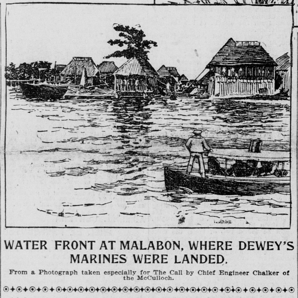 which greatly hinder the advance of troops. In the foreground is the Utah Artillery and line of Kansas trenches extending to the water overlooking Malabon, which can be seen in the distance. The famous Malabon bridge and cathedral are also shown, as well as the insurgent trenches (marked x) which were only a few hundred feet away.