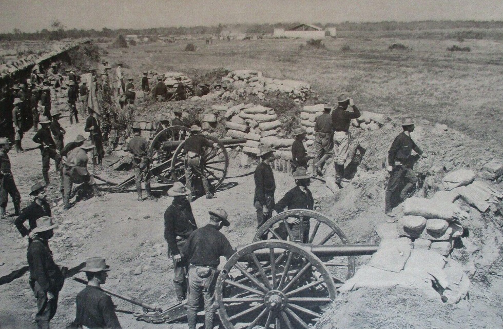 Utah Battery in action at Caloocan. The gunners have ceased firing to note the effect of a shot.