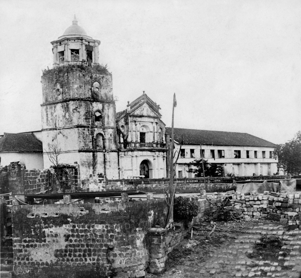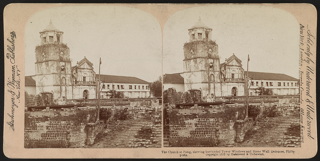 The church at Pasig, showing barricaded tower windows and stone wall defences, Philippines
