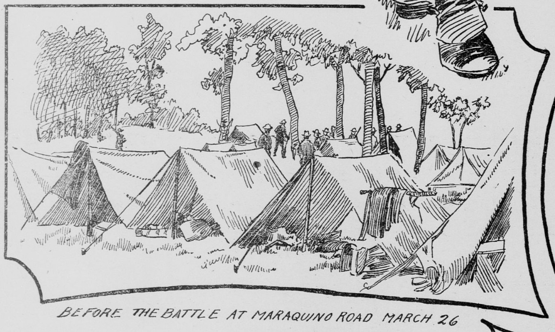 March 23, 1900.—Companies A, D, K, and M, Forty-fifth Infantry, U. S. V., and Company G, Thirty-seventh Infantry, U. S. V., are met at Camalig, P. I., by a furious fire from insurgents on hills to right of road, and again near Darago. Two insurgents are killed, a number wounded, and 1 rifle captured.