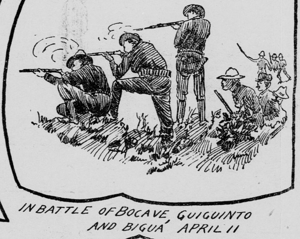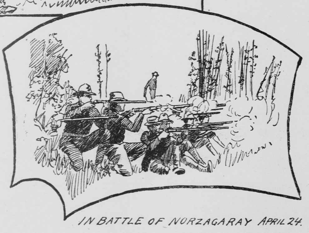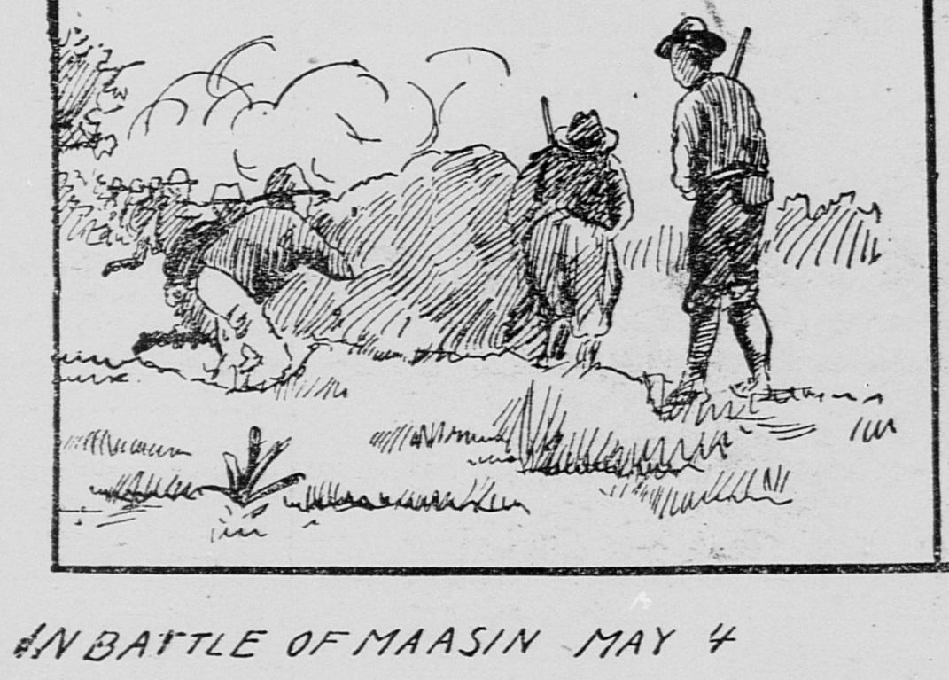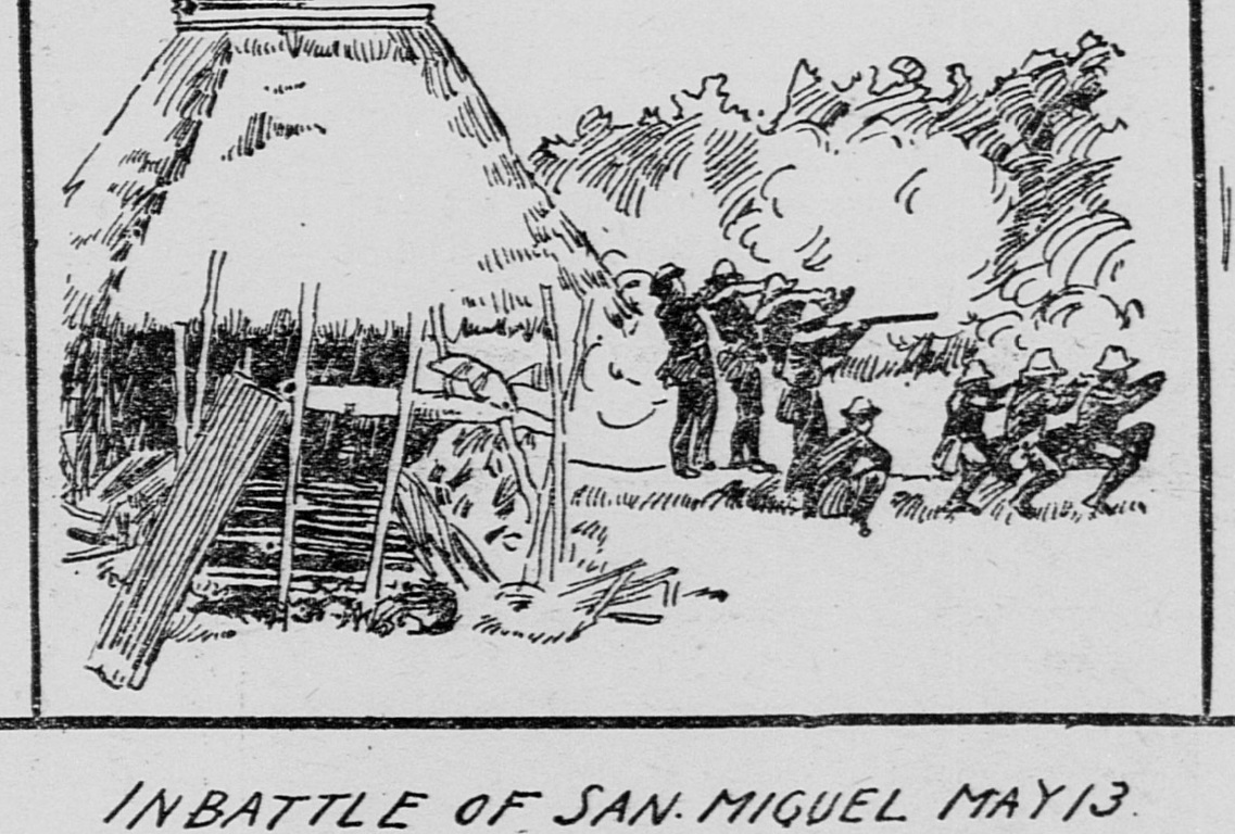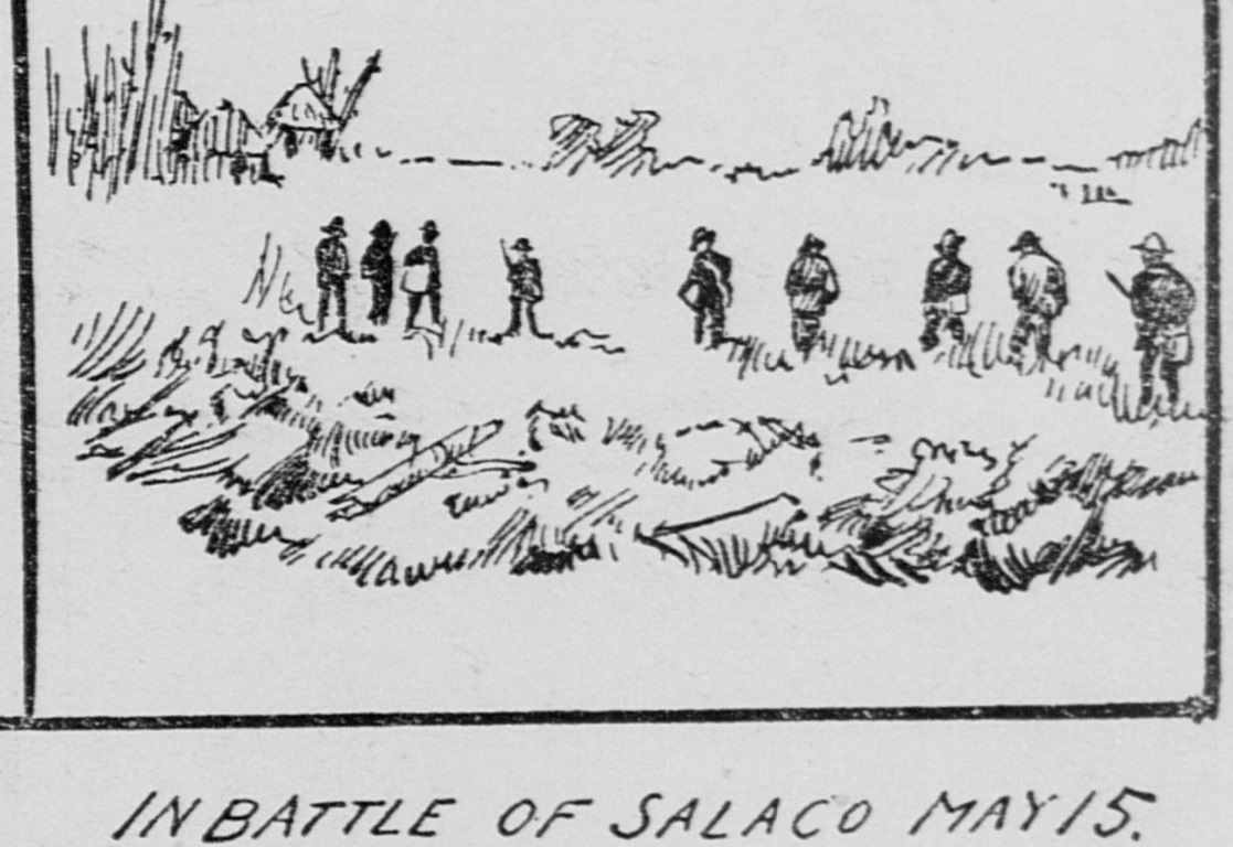 April 30, 1900.—A pack train, in charge of Corporal Wilber, with 6 men from Company G and a detachment of Company E, Thirty-third Infantry, U. S. V., is attacked at Salcedo, P. I., by 150 insurgents, one-third of whom are armed with rifles and the rest with bolos, and, after an hour's sharp fighting, during which the Americans make two charges, the insurgents withdraw with a loss of 25 men killed. Number of wounded unknown.