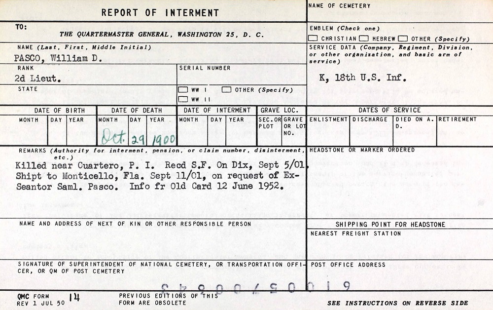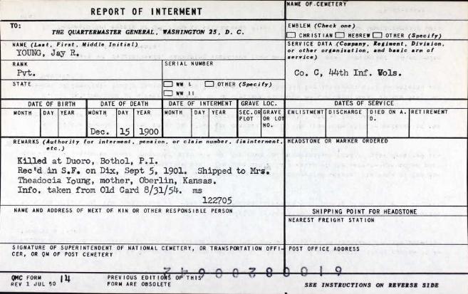 Seitz, Julius, d. 09/17/1900, PVT CO D 19TH US INF, Died In Pi, Recd Sf On Dix 9/5/01, Plot: 641, bur. 11/15/1901, *