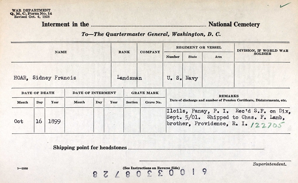 Littlefield, Roderick, d. 04/25/1901, PVT CO F 18TH REGT US INFY, Died In Pi Recd Sf On Dix 9/5/01, Plot: NEW A588, *